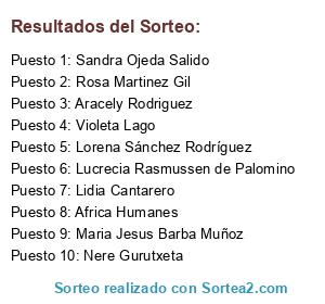 Lista de participantes: Rocío DC, Carolina Fernández, Mónica Agüero Fernández, Yasnaia Altube Lira, Miranda Bouzo, Mara Oliver, Fransy Guerrero, Cristi PB, Almudena Gutierrez, Virginia VB, Violeta Lago, Maria Jesus Barba Muñoz, Lucrecia Rasmussen de Palomino, Marivi Casado, Evelyn Flores, Paqui Medina Ivorra, M Lorena Carrasco, Lucia Herrero, Raquel Arias Suárez, Mari Carmen Sanchez, Sandra Ojeda Salido, Rosa Martinez Gil, Lorena Sánchez Rodríguez, Belinda Toledo, Nere Gurutxeta, Africa Humanes, Cati Carrasco, Aracely Rodriguez, Lidia Cantarero, Marina Collazo Casal, Mayte Esteban, Mónica Gallart, Eva Maria Serrano Navas, Luce Wd Teller.