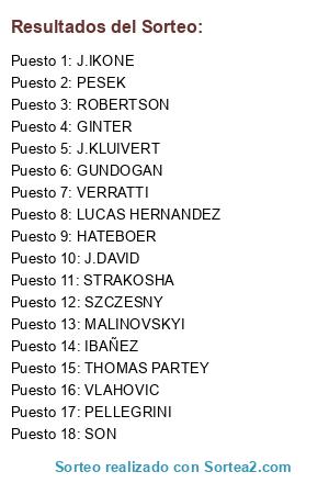 Lista de participantes: SZCZESNY, MIGNOLET, BASSEY, GINTER, IBAÑEZ, L.HERNANDEZ, MAZRAOUI, OSAYI-SAMUEL, HATEOBER, GUNDOGAN, VERRATTI, T. PARTEY, HOLES, ZAMBO ANGUSSIA, PELLEGRINI, KLUIVERT, MALINOVSKY, J. DAVID, IÑAKI WILLIAMS, BECKER, BAILEY, ORSIC.