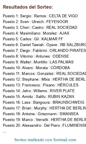Lista de participantes: Ciaran Clark AJAX, Kyle Walker AJAX, Andres Guardado AJAX, Javier Chicharito AJAX, Micah Richards AJAX, Jesus Navas AJAX, Marc Albrighton AJAX, Kevin-Prince Boateng AJAX, Felipe Santana AJAX, Aaron Lennon AJAX, Brad Guzan AJAX, Karim El Ahmadi AJAX, Mariano Ferreira Filho AJAX, Carlos Vela AJAX, Hugo Ayala AJAX, Maximiliano Moralez AJAX, Radja Nainggolan AJAX, Mickael Landreau AJAX, Ruben Garcia AJAX, Onur Recep Kivrak AJAX, Clement Grenier ANDERLECHT, Sebastian Jung ANDERLECHT, Moritz Leitner ANDERLECHT, Nuri Sahin ANDERLECHT, Michel Bastos ANDERLECHT, Serigne Kara ANDERLECHT, Adil Rami ANDERLECHT, Matias Suarez ANDERLECHT, Silvio Proto ANDERLECHT, Bram Nuytinck ANDERLECHT, Dennis Praet ANDERLECHT, Massimo Bruno ANDERLECHT, Cyriac Gohi Bi ANDERLECHT, Junior Hoilett ANDERLECHT, Fabio Deivson Lopes Maciel ANDERLECHT, Adryan Oliveira Tavares ANDERLECHT, Ze Roberto da Silva Junior ANDERLECHT, Marcos (Marquinhos) Aoas Correa ANDERLECHT, Joao Miranda de Souza ANDERLECHT, Brad Friedel ANDERLECHT, Mauro Icardi ANDERLECHT, Carles Puyol ATH. BILBAO, Maicon ATH. BILBAO, Andoni Iraola ATH. BILBAO, Mikel San Jose ATH. BILBAO, Fernando Amorebieta ATH. BILBAO, Markel Susaeta ATH. BILBAO, Iker Muniain ATH. BILBAO, Aritz Aduriz ATH. BILBAO, Fernando Llorente ATH. BILBAO, Mikel Arteta ATH. BILBAO, Nacho Monreal ATH. BILBAO, Ander Iturraspe ATH. BILBAO, Oscar De Marcos ATH. BILBAO, Vieirinha ATH. BILBAO, Mathieu Valbuena ATH. BILBAO, Nicolas Gaitan ATH. BILBAO, Antonio Nocerino ATH. BILBAO, Iñigo Perez ATH. BILBAO, Raul Fernandez ATH. BILBAO, Xabier Castillo ATH. BILBAO, Carlos Gurpegi ATH. BILBAO, Isma Lopez ATH. BILBAO, Mario Suarez ATH. BILBAO, Roberto Jimenez ATH. BILBAO, Joel Campbell BETIS, Mario Sampirisi BETIS, Alvaro Vadillo BETIS, Alejandro Pozuelo BETIS, Erik Lamela BETIS, Didac Vila BETIS, Miralem Pjanic BETIS, Thibaut Courtois BETIS, Alvaro Gonzalez BETIS, Diego Costa BETIS, Sebastien Bassong BETIS, Jesus Joaquin Suso BETIS, Bruno Alves BETIS, Sebastien Corchia BETIS, Adrian San Miguel del Castillo BETIS, Alex Martinez BETIS, Ruben Perez BETIS, Jose Alberto Cañas BETIS, Juan Carlos Perez BETIS, Ruben Castro BETIS, Nosa Igiebor BETIS, Nono Delgado Villar BETIS, Alejandro Arribas BETIS, Cedric Soares BETIS, Vicente Guaita BRAUNSCHWEIG, Lass Bangoura BRAUNSCHWEIG, Ignacio Camacho BRAUNSCHWEIG, Jonathan Viera BRAUNSCHWEIG, Philippe Coutinho BRAUNSCHWEIG, Hector Moreno BRAUNSCHWEIG, Mamadou Sakho BRAUNSCHWEIG, Sergio Tejera BRAUNSCHWEIG, Diego Contento BRAUNSCHWEIG, Mubarak Wakaso BRAUNSCHWEIG, Samir Nasri BRAUNSCHWEIG, Daniel Sturridge BRAUNSCHWEIG, Koke Resurrección Merodio BRAUNSCHWEIG, Felipe Mattioni BRAUNSCHWEIG, Thievy Bifouma BRAUNSCHWEIG, Márcio Rafinha BRAUNSCHWEIG, Mapou Yanga-Mbiwa BRAUNSCHWEIG, Jose Manuel Pinto BRAUNSCHWEIG, Rodrigo Moreno BRAUNSCHWEIG, Raul Rodriguez BRAUNSCHWEIG, Javi Lopez BRAUNSCHWEIG, Samuele Longo BRAUNSCHWEIG, Edgar Badia BRAUNSCHWEIG, Thorgan Hazard BRAUNSCHWEIG, Raphael Varane CELTA DE VIGO, Sergio Ramos CELTA DE VIGO, Diego Lopez CELTA DE VIGO, Julio Baptista CELTA DE VIGO, Sebastian Giovinco CELTA DE VIGO, Diego Capel CELTA DE VIGO, Geoffrey Kondogbia CELTA DE VIGO, Bryan Rabello CELTA DE VIGO, Javi Varas CELTA DE VIGO, Andres Tuñez CELTA DE VIGO, Samuel Llorca CELTA DE VIGO, Roberto Lago CELTA DE VIGO, Borja Oubiña CELTA DE VIGO, Augusto Fernandez CELTA DE VIGO, Natxo Insa CELTA DE VIGO, Michael Krohn-Dehli CELTA DE VIGO, Mario Bermejo CELTA DE VIGO, Cicinho Sandro Mendonça dos Santos CELTA DE VIGO, Kelvin Mateus de Oliveira CÓRDOBA, Alvaro Morata CÓRDOBA, Steven Caulker CÓRDOBA, Julian Schieber CÓRDOBA, Bernd Leno CÓRDOBA, Peniel Mlapa CÓRDOBA, Marco Reus CÓRDOBA, Granit Xhaka CÓRDOBA, Mauricio Isla CÓRDOBA, Isco Alarcon CÓRDOBA, Paul Pogba CÓRDOBA, Kerim Frei CÓRDOBA, Marko Marin CÓRDOBA, Aleksandar Dragovic CÓRDOBA, Sead Kolasinac CÓRDOBA, Tony Jantschke CÓRDOBA, Juan Arango CÓRDOBA, Jack Butland CÓRDOBA, Lorenzo Melgarejo CÓRDOBA, Cristian Zapata CÓRDOBA, Tonny Trindade de Vilhena CÓRDOBA, Emre Can CÓRDOBA, Max Meyer CÓRDOBA, Fabian Delph DEPORTIVO A CORUÑA, Ganso DEPORTIVO A CORUÑA, Seydou Doumbia DEPORTIVO A CORUÑA, Lucas Moura Da Silva DEPORTIVO A CORUÑA, Jadson Rodrigues da Silva DEPORTIVO A CORUÑA, Roland Lamah DEPORTIVO A CORUÑA, Jasper Cillessen DEPORTIVO A CORUÑA, Denis Cesar de Matos DEPORTIVO A CORUÑA, Rafael Toloi DEPORTIVO A CORUÑA, Luiz Rhodolfo Dini Gaioto DEPORTIVO A CORUÑA, Paolo Miranda Jonathan Doin DEPORTIVO A CORUÑA, Bruno Cortes Barbosa DEPORTIVO A CORUÑA, Douglas Pereira dos Santos DEPORTIVO A CORUÑA, Wellington Aparecido Martins DEPORTIVO A CORUÑA, Fabricio de Souza DEPORTIVO A CORUÑA, Paulo Assunçao da Silva DEPORTIVO A CORUÑA, Denilson Preira Neves DEPORTIVO A CORUÑA, William Jose da Silva DEPORTIVO A CORUÑA, Eder Antonio Macedo Lopes DEPORTIVO A CORUÑA, Javier Aquino DEPORTIVO A CORUÑA, Anele Ngcongca DEPORTIVO A CORUÑA, Alex Oxlade-Chamberlain DINAMO DE MOSCU, Alexander Kokorin DINAMO DE MOSCU, Andre Carrillo DINAMO DE MOSCU, Jordy Clasie DINAMO DE MOSCU, Adem Ljajic DINAMO DE MOSCU, Cristian Eriksen DINAMO DE MOSCU, Kieran Gibbs DINAMO DE MOSCU, Balazs Dzsudzsak DINAMO DE MOSCU, Kevin Kuranyi DINAMO DE MOSCU, Kenneth Vermeer DINAMO DE MOSCU, Anton Shunin DINAMO DE MOSCU, Leandro Fernandez DINAMO DE MOSCU, Luke Wilkshire DINAMO DE MOSCU, Nikita Chicherin DINAMO DE MOSCU, Christian Noboa DINAMO DE MOSCU, Aleksandr Sapeta DINAMO DE MOSCU, Facundo Roncaglia DINAMO DE MOSCU, Niklas Moisander DINAMO DE MOSCU, Isaac Vorsah DINAMO DE MOSCU, Gunter Arnberger DINAMO DE MOSCU, Modibo Diakite DINAMO DE MOSCU, Nemaja Matic DINAMO DE MOSCU, Danny Welbeck FEYENOOR, Kim Ojo FEYENOOR, Markus Henriksen FEYENOOR, Leroy Fer FEYENOOR, Lewis Holtby FEYENOOR, Serdar Tasci FEYENOOR, Joel Matip FEYENOOR, Emilio Nsue FEYENOOR, Stefan De Vrij FEYENOOR, Neven Subotic FEYENOOR, Vedad Ibisevic FEYENOOR, Moussa Sissoko FEYENOOR, Stefanos Kapino FEYENOOR, Sven Ulreich FEYENOOR, An