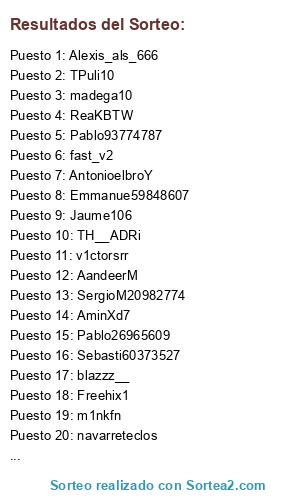 Lista de participantes: Ninguno321, m1nkfn, lareo100, AminXd7, Diiego92400588, JosePujadas10, GersonR95746558, Pedro74439735, Otrochicoms2, madega10, Pitroll1, CoRcliX, Mpradillos, Sergio04154426, joaquincg21, Sergi67532930, Iker99563535, Santiag32472765, Jaume106, Rafael43658074, fast_v2, raul_macarro, ESGabby19, Pablo93774787, r_chaparr, _jorgemrtnez, blazzz__, AntonioelbroY, r0ckz3FN, baginon, Emmanue59848607, TPuli10, RoviiFN, dreciooo, Alexis_als_666, Paleret1, Martolini123, SergioM20982774, wilmarstiven3, Petko03616272, Marc28908275, kaliman2763, SecretHiro2, ByTilus, xx_tcs, javijs101, BylinkdarkY, kriskmposk, abidanrodri13, Samuel01139649, Pablo26965609, Javier98979, Oriol94007735, Wuzzix1, TH__ADRi, oscuriogamer, Ivengg12, SanllehiGodo, mohamed15577532, JuanPue69266161, Sebasti60373527, jmz20152, v1ctorsrr, navarreteclos, toniflus, twitchpani, JoaqunTejada4, AandeerM, Miguel_gao05, Diego37687321, XxoIts, gamer04_suha, daniuss12, davironfp1, AlexConejo18, maneloozk, ReaKBTW, gea_74_, TcmSecret, eric_campoy23__, Pedroj21121, maksim44414, Freehix1, Kaneki13334, Jxhn_cg, furior745, evar12473914, EdgarAg68395012, altair2mil.