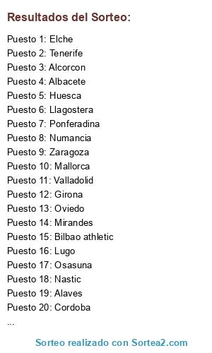 Lista de participantes: Bilbao athletic, Zaragoza, Osasuna, Valladolid, Mallorca, almeria, Tenerife, Oviedo, Elche, Cordoba, Alaves, Girona, Nastic, Leganes, Albacete, Huesca, Lugo, Ponferadina, Llagostera, Numancia, Mirandes, Alcorcon.