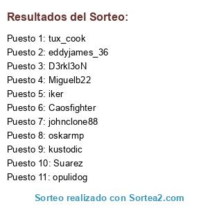 Lista de participantes: tux_cook, Miguelb22, johnclone88, D3rkl3oN, eddyjames_36, opulidog, kustodic, Caosfighter, oskarmp, Suarez, iker.