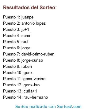 Lista de participantes: jorge, jorge-cuñao, gonx, gonx-vecino, gonx-bro, ruben, david-primo-ruben, antonio lopez, juanpe, jp+1, semi, raul, raul-hermano, cuña+1.