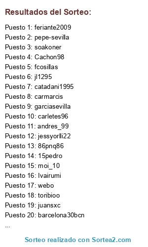 Lista de participantes: Ivairumi, moi_10, andres_99, barcelona30bcn, carletes96, carmarcis, catadani1995, soakoner, dailetc, degea2502, fcosillas, feriante2009, garciasevilla, jessyorlli22, jodaem, jl1295, juansxc, pepe-sevilla, XxJAVILGxX, toribioo, 15pedro, webo, 86pnq86, Cachon98.