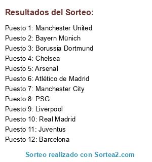 Lista de participantes: Atlético de Madrid, Borussia Dortmund, Real Madrid, Bayern Münich, Manchester United, Barcelona, Manchester City, Arsenal, Juventus, PSG, Chelsea, Liverpool.