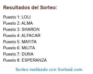 Lista de participantes: DUNA, LOLI, SHARON, MAYITA, ALMA, MILITA, ESPERANZA, ALFACAR.