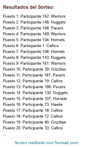 Lista de participantes: Participante 1: Celtics, Participante 2: Celtics, Participante 3: Celtics, Participante 4: Celtics, Participante 5: Celtics, Participante 6: Celtics, Participante 7: Celtics, Participante 8: Celtics, Participante 9: Celtics, Participante 10: Celtics, Participante 11: Celtics, Participante 12: Celtics, Participante 13: Celtics, Participante 14: Celtics, Participante 15: Celtics, Participante 16: Celtics, Participante 17: Celtics, Participante 18: Celtics, Participante 19: Celtics, Participante 20: Celtics, Participante 21: Celtics, Participante 22: Celtics, Participante 23: Celtics, Participante 24: Celtics, Participante 25: Celtics, Participante 26: Celtics, Participante 27: Celtics, Participante 28: Celtics, Participante 29: Celtics, Participante 30: Celtics, Participante 31: Celtics, Participante 32: Celtics, Participante 33: Celtics, Participante 34: Celtics, Participante 35: Celtics, Participante 36: Celtics, Participante 37: Grizzlies, Participante 38: Grizzlies, Participante 39: Grizzlies, Participante 40: Grizzlies, Participante 41: Grizzlies, Participante 42: Grizzlies, Participante 43: Grizzlies, Participante 44: Grizzlies, Participante 45: Grizzlies, Participante 46: Grizzlies, Participante 47: Grizzlies, Participante 48: Grizzlies, Participante 49: Grizzlies, Participante 50: Grizzlies, Participante 51: Grizzlies, Participante 52: Grizzlies, Participante 53: Hawks, Participante 54: Hawks, Participante 55: Hawks, Participante 56: Hawks, Participante 57: Hawks, Participante 58: Hawks, Participante 59: Hawks, Participante 60: Hawks, Participante 61: Hawks, Participante 62: Hawks, Participante 63: Hawks, Participante 64: Hawks, Participante 65: Hawks, Participante 66: Hawks, Participante 67: Hawks, Participante 68: Hawks, Participante 69: Hawks, Participante 70: Hawks, Participante 71: Hawks, Participante 72: Hawks, Participante 73: Hawks, Participante 74: Hawks, Participante 75: Hawks, Participante 76: Hawks, Participante 77: Hawks, Participante 78: Heat, Participante 79: Heat, Participante 80: Heat, Participante 81: Heat, Participante 82: Heat, Participante 83: Heat, Participante 84: Heat, Participante 85: Heat, Participante 86: Heat, Participante 87: Heat, Participante 88: Heat, Participante 89: Heat, Participante 90: Heat, Participante 91: Heat, Participante 92: Heat, Participante 93: Heat, Participante 94: Heat, Participante 95: Heat, Participante 96: Hornets, Participante 97: Hornets, Participante 98: Hornets, Participante 99: Hornets, Participante 100: Hornets, Participante 101: Hornets, Participante 102: Hornets, Participante 103: Hornets, Participante 104: Hornets, Participante 105: Hornets, Participante 106: Hornets, Participante 107: Hornets, Participante 108: Hornets, Participante 109: Hornets, Participante 110: Hornets, Participante 111: Hornets, Participante 112: Hornets, Participante 113: Hornets, Participante 114: Hornets, Participante 115: Hornets, Participante 116: Hornets, Participante 117: Hornets, Participante 118: Hornets, Participante 119: Hornets, Participante 120: Hornets, Participante 121: Hornets, Participante 122: Hornets, Participante 123: Hornets, Participante 124: Hornets, Participante 125: Hornets, Participante 126: Hornets, Participante 127: Hornets, Participante 128: Hornets, Participante 129: Nuggets, Participante 130: Nuggets, Participante 131: Nuggets, Participante 132: Nuggets, Participante 133: Nuggets, Participante 134: Nuggets, Participante 135: Nuggets, Participante 136: Nuggets, Participante 137: Nuggets, Participante 138: Nuggets, Participante 139: Nuggets, Participante 140: Nuggets, Participante 141: Nuggets, Participante 142: Nuggets, Participante 143: Nuggets, Participante 144: Nuggets, Participante 145: Nuggets, Participante 146: Nuggets, Participante 147: Nuggets, Participante 148: Nuggets, Participante 149: Warriors, Participante 150: Warriors, Participante 151: Warriors, Participante 152: Warriors, Participante 153: Warriors, Participante 154: Warriors, Participante 155: Warriors, Participante 156: Warriors, Participante 157: Warriors, Participante 158: Warriors, Participante 159: Warriors, Participante 160: Warriors, Participante 161: Warriors, Participante 162: Warriors, Participante 163: Warriors, Participante 164: Warriors, Participante 165: Warriors, Participante 166: Warriors, Participante 167: Pacers, Participante 168: Pacers, Participante 169: Pacers, Participante 170: Pacers, Participante 171: Pacers, Participante 172: Pacers, Participante 173: Pacers, Participante 174: Pacers, Participante 175: Pacers, Participante 176: Pacers, Participante 177: Pacers, Participante 178: Pacers, Participante 179: Pacers, Participante 180: Pacers, Participante 181: Pacers, Participante 182: Pacers, Participante 183: Pacers, Participante 184: Pacers, Participante 185: Pacers, Participante 186: Pacers, Participante 187: Pacers, Participante 188: Pacers, Participante 189: Pacers.