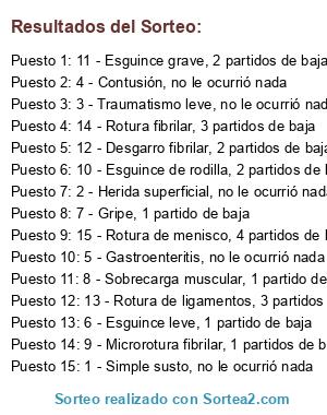 Lista de participantes: 1 - Simple susto, no le ocurrió nada, 2 - Herida superficial, no le ocurrió nada, 3 - Traumatismo leve, no le ocurrió nada, 4 - Contusión, no le ocurrió nada, 5 - Gastroenteritis, no le ocurrió nada, 6 - Esguince leve, 1 partido de baja, 7 - Gripe, 1 partido de baja, 8 - Sobrecarga muscular, 1 partido de baja, 9 - Microrotura fibrilar, 1 partidos de baja, 10 - Esguince de rodilla, 2 partidos de baja, 11 - Esguince grave, 2 partidos de baja, 12 - Desgarro fibrilar, 2 partidos de baja, 13 - Rotura de ligamentos, 3 partidos de baja, 14 - Rotura fibrilar, 3 partidos de baja, 15 - Rotura de menisco, 4 partidos de baja.