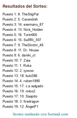 Lista de participantes: (Ruka21), (Mouwned), (toni_v13), (Tipster), (firedragon), (ruben1890), (NoxBand), (GatoIsidoro), (buesa), (O'Driscoll), (Vespanol), (David Soprano), (hakhak5), (Menchov), (Last), (zAiA), - (Joe34), (cordobilla), (Marduk_69), (Hez83), (Jarumo).