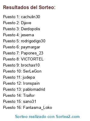 Lista de participantes: sano31, SerLeGon, Derdopolis, Djave, pablomadrid, Ironspain, Papones_23, paymargar, judepa, cachulin30, VICTORTEL, Traifor, Fantasma_Loko, jesema, brochas10, rodrigodigo30.