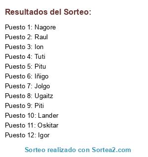 Lista de participantes: Piti, Nagore, Jolgo, Tuti, Pitu, Ion, Igor, Iñigo, Ugaitz, Raul, Oskitar, Lander.