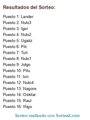 Lista de participantes: Piti, Nagore, Jolgo, Tuti, Pitu, Ion, Igor, Iñigo, Ugaitz, Raul, Oskitar, Lander, Nulo1, Nulo2, Nulo3, Nulo4.