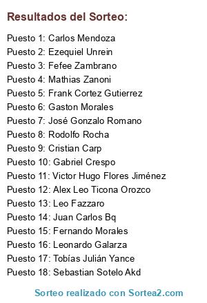 Lista de participantes: Mathias Zanoni, Leo Fazzaro, Gabriel Crespo, Juan Carlos Bq, Ezequiel Unrein, Rodolfo Rocha, Leonardo Galarza, Fefee Zambrano, Alex Leo Ticona Orozco, Frank Cortez Gutierrez, Fernando Morales, José Gonzalo Romano, Carlos Mendoza, Sebastian Sotelo Akd, Gaston Morales, Victor Hugo Flores Jiménez, Cristian Carp, Tobías Julián Yance.