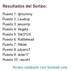 Lista de participantes: SikO124, raicoht, djmummy, duke17, Rattlehead, Laudrup, jesusmp, julyano1, Niklas, Vegeta.