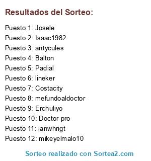 Lista de participantes: Josele, antycules, Doctor pro, Balton, Erchuliyo, Isaac1982, Costacity, Padial, mefundoaldoctor, ianwhrigt, lineker, mikeyelmalo10.