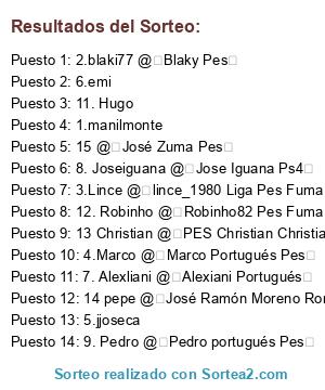 Lista de participantes: 1.manilmonte, 2.blaki77 @Blaky Pes, 3.Lince @lince_1980 Liga Pes Fuma España🇪🇸, 4.Marco @Marco Portugués Pes, 5.jjoseca, 6.emi, 7. Alexliani @Alexiani Portugués, 8. Joseiguana @Jose Iguana Ps4, 9. Pedro @Pedro portugués Pes, 11. Hugo, 12. Robinho @Robinho82 Pes Fuma España, 13 Christian @PES Christian Christian87roy, 14 pepe @José Ramón Moreno Romero, 15 @José Zuma Pes.