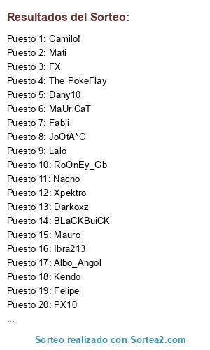 Lista de participantes: hugO, XunXoOThebesT, Ibra213, Zega, Rolocr10, Fabii, El gonza, Mauro, Topo, Lalo, Kezon, Camilo!, Aioria, Darkoxz, MaUriCaT, chit0x_14, Scofield, The PokeFlay, Enxogb1, Kendo, JoOtA*C, Panda, Wawo, Mati, PX10, CrozZ, FX, Laffatiga, Xpektro, jFam, Felipe, PepeGanja, Shizk639, RoOnEy_Gb, BLaCKBuiCK, Nacho, CacikeGB, Albo_Angol, Dany10, Klau.