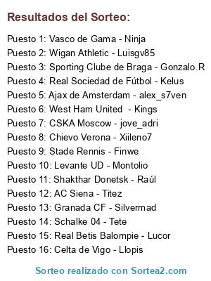 Lista de participantes: AC Siena - Titez, Granada CF - Silvermad, Schalke 04 - Tete, Celta de Vigo - Llopis, Wigan Athletic - Luisgv85, Vasco de Gama - Ninja, Real Sociedad de Fútbol - Kelus, West Ham United - Kings, Stade Rennis - Finwe, Real Betis Balompie - Lucor, Chievo Verona - Xiileno7, CSKA Moscow - jove_adri, Shakthar Donetsk - Raúl, Levante UD - Montolio, Sporting Clube de Braga - Gonzalo.R, Ajax de Amsterdam - alex_s7ven.