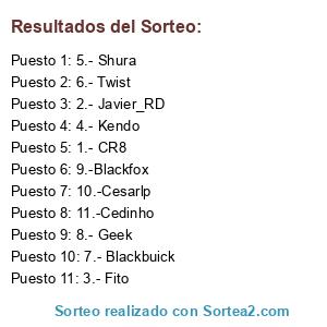 Lista de participantes: 1.- CR8, 2.- Javier_RD, 3.- Fito, 4.- Kendo, 5.- Shura, 6.- Twist, 7.- Blackbuick, 8.- Geek, 9.-Blackfox, 10.-Cesarlp, 11.-Cedinho.