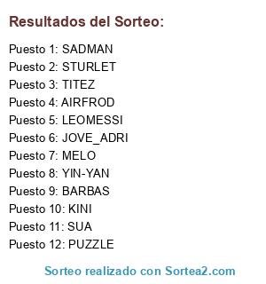 Lista de participantes: BARBAS, AIRFROD, JOVE_ADRI, KINI, MELO, SADMAN, STURLET, YIN-YAN, SUA, TITEZ, PUZZLE, LEOMESSI.