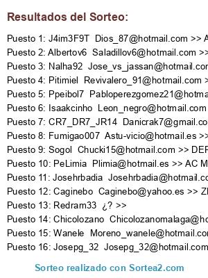 Lista de participantes: @Dios_87, @Chucki15, @Caginebo, @Danicrak7, @Jose_vs_jassan, @Revivalero_91, @Chicolozanomalaga, @Moreno_wanele, @Leon_negro, @Josepg_32, Redram33 <--> ¿? >>, @Josehrbadia, @Pabloperezgomez21, @Astu-vicio, @Saladillov6, @Plimia.
