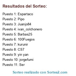 Lista de participantes: kurunir, ivan_colchonero, yin yan, jorgefumi, Ser, Pipo, Espartaco, Barbas25, CS7, Juanjo84, 100Fuegos.