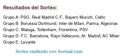 Lista de participantes: PSG, PSV, Algeciras, F.C. Barcelona, Real Madrid C.F., At. Madrid, Tottenham, Borussia Dortmund, Bayern Munich, Fiorentina, Parma, Levante, AC Milan, Malaga, Inter de Milan, Celtic, Rayo Vallecano.