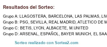 Lista de participantes: ATLETICO DE MADRID, LAS PALMAS, LLAGOSTERA, ARSENAL, PSG, SEVILLA, ALBACETE, REAL MADRID, LYON, BAYER MUNICH, M.UNITED, EL SAAD, BARCELONA, ESPAÑOL, BETIS, LIVERPOOL.