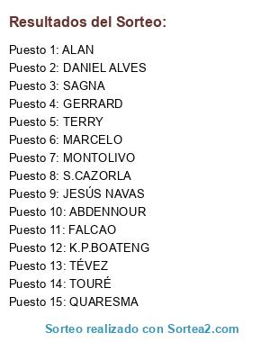 Lista de participantes: TERRY, TOURÉ, DANIEL ALVES, MARCELO, SAGNA, ABDENNOUR, GERRARD, MONTOLIVO, S.CAZORLA, K.P.BOATENG, JESÚS NAVAS, QUARESMA, TÉVEZ, FALCAO, ALAN.