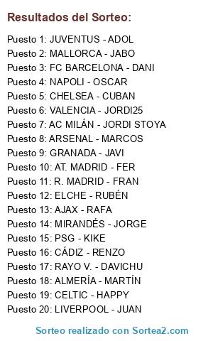 Lista de participantes: ALMERÍA - MARTÍN, R. MADRID - FRAN, CELTIC - HAPPY, GRANADA - JAVI, AT. MADRID - FER, RAYO V. - DAVICHU, VALENCIA - JORDI25, AJAX - RAFA, CÁDIZ - RENZO, MALLORCA - JABO, CHELSEA - CUBAN, AC MILÁN - JORDI STOYA, JUVENTUS - ADOL, LIVERPOOL - JUAN, ARSENAL - MARCOS, NAPOLI - OSCAR, PSG - KIKE, MIRANDÉS - JORGE, FC BARCELONA - DANI, ELCHE - RUBÉN.