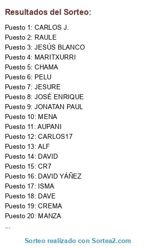 Lista de participantes: ALF, CREMA, DAVE, DAVID, CHAMA, DASANDO, RAULE, JESURE, DAVID YÁÑEZ, TWONEAGU, MARITXURRI, JESÚS BLANCO, ARMANDO, KARPIN, AUPANI, VÍCTOR, ISMA, JOSÉ ENRIQUE, CENACHERO, MANZA, MENA, RAMÓN, ELVIS, DOMIN, CARLOS17, CARLOS J., PELU, BENIHH, CR7, JONATAN PAUL.
