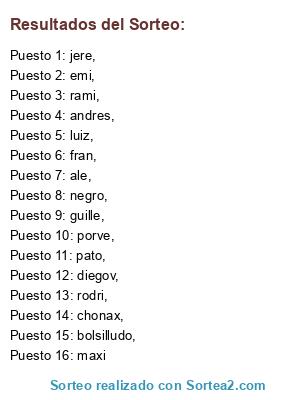 Lista de participantes: porve,, luiz,, jere,, chonax,, fran,, rodri,, ale,, guille,, rami,, bolsilludo,, negro,, diegov,, pato,, emi,, andres,, maxi.