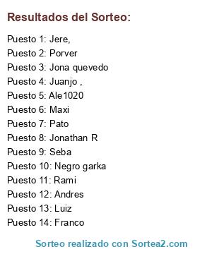 Lista de participantes: Jere,, Maxi, Juanjo ,, Franco, Ale1020, Jona quevedo, Andres, Jonathan R, Porver, Luiz, Rami, Seba, Negro garka, Pato.