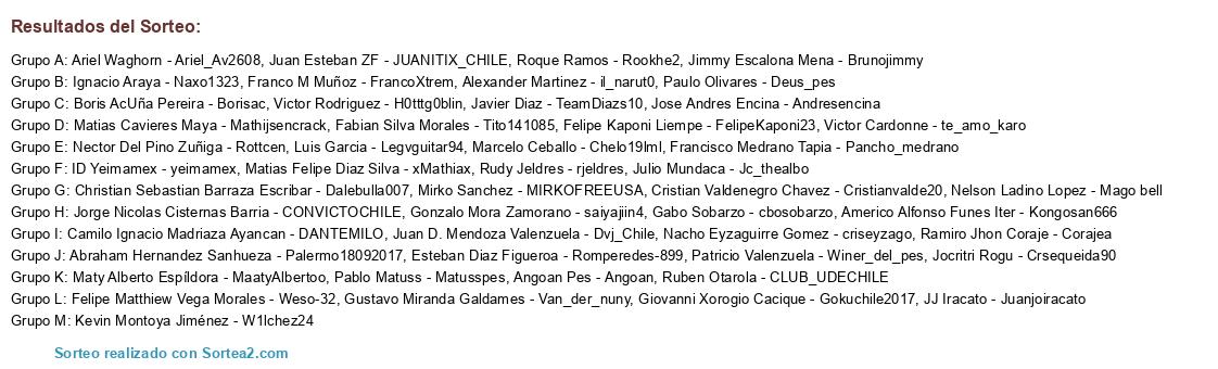 Lista de participantes: Felipe Kaponi Liempe - FelipeKaponi23, Ruben Otarola - CLUB_UDECHILE, Gonzalo Mora Zamorano - saiyajiin4, Franco M Muñoz - FrancoXtrem, Juan Esteban ZF - JUANITIX_CHILE, Ignacio Araya - Naxo1323, Felipe Matthiew Vega Morales - Weso-32, Angoan Pes - Angoan, Roque Ramos - Rookhe2, Giovanni Xorogio Cacique - Gokuchile2017, Patricio Valenzuela - Winer_del_pes, Matias Felipe Diaz Silva - xMathiax, Americo Alfonso Funes Iter - Kongosan666, Nacho Eyzaguirre Gomez - criseyzago, Jorge Nicolas Cisternas Barria - CONVICTOCHILE, Francisco Medrano Tapia - Pancho_medrano, Christian Sebastian Barraza Escribar - Dalebulla007, Nelson Ladino Lopez - Mago bell, Abraham Hernandez Sanhueza - Palermo18092017, Matias Cavieres Maya - Mathijsencrack, Gustavo Miranda Galdames - Van_der_nuny, Nector Del Pino Zuñiga - Rottcen, Julio Mundaca - Jc_thealbo, Javier Diaz - TeamDiazs10, ID Yeimamex - yeimamex, Gabo Sobarzo - cbosobarzo, Marcelo Ceballo - Chelo19lml, Cristian Valdenegro Chavez - Cristianvalde20, Victor Rodriguez - H0tttg0blin, Jose Andres Encina - Andresencina, Ariel Waghorn - Ariel_Av2608, Paulo Olivares - Deus_pes, Boris AcUña Pereira - Borisac, Camilo Ignacio Madriaza Ayancan - DANTEMILO, Jocritri Rogu - Crsequeida90, Maty Alberto Espíldora - MaatyAlbertoo, Juan D. Mendoza Valenzuela - Dvj_Chile, Alexander Martinez - il_narut0, Luis Garcia - Legvguitar94, Jimmy Escalona Mena - Brunojimmy, Kevin Montoya Jiménez - W1lchez24, Victor Cardonne - te_amo_karo, Esteban Diaz Figueroa - Romperedes-899, JJ Iracato - Juanjoiracato, Mirko Sanchez - MIRKOFREEUSA, Ramiro Jhon Coraje - Corajea, Rudy Jeldres - rjeldres, Pablo Matuss - Matusspes, Fabian Silva Morales - Tito141085.