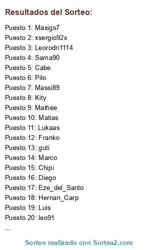 Lista de participantes: Fede, Tatunion, Mathee, xsergio92x, Sama90, Fede_1710, Pablo91, leo91, Pablin19, Eze_del_Santo, Kity, Marco, Luis, max-, Chipi, Leorodri1114, Lukaas, Bako, Buffon, Massi89, Hernan_Carp, Matias, Poli, Maxigs7, Braiian, guti, Pilo, Jdc, Pat0, Franko, Cabe, Diego.