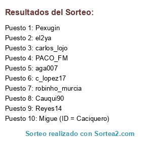 Lista de participantes: Pexugin, aga007, c_lopez17, Reyes14, Migue (ID = Caciquero), Cauqui90, carlos_lojo, el2ya, robinho_murcia, PACO_FM.