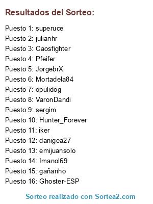 Lista de participantes: emijuansolo, VaronDandi, superuce, julianhr, danigea27, Caosfighter, iker, Mortadela84, gañanho, opulidog, JorgebrX, Pfeifer, sergim, Imanol69, Hunter_Forever, Ghoster-ESP.