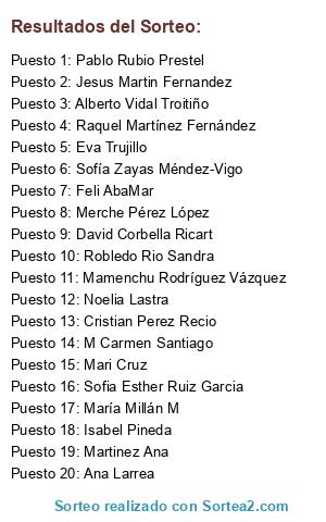 Lista de participantes: Sofía Zayas Méndez-Vigo, Xeny Sin Mas, Covadonga Fernandez de Orueta, Álvaro Arroyo Courel, Ana Anita, Clínica Estética Dental Anglada, Mercedes Nimo García, Horten Alfaro, Óscar Jesús, Davinia Saiz, Maria Corella, Jose Jimeno, Noelia Lastra, Ana Isabel Cano, Jesus Garcia, Cristian Perez Recio, José Luis Rodríguez, Mar Valle Fresæ Fresa, Mari Hayado Fernandez, Yolis Oneida Palma Rojas, Robledo Rio Sandra, Gloria Urquidi, Hortensia Fernandez, Mamenchu Rodríguez Vázquez, Oscar Garcia, Javier Salido Mones, Silvia G Cocinitas, Nuria Cabello, Tabasco España, Administrador, Silvia Cocinitas, Francisco Sempere Navarro, Elena Maria Jara Garcia, Aritz Galdos Emaldi, Adela Mistral Gil, Antonio Bercianos San Ceferino, Rosi Jabalera, Veronica Garcia, Rafael Arrebola, Sergio Arnaiz Delgado, Josefina Yébenes, Astrid Alonso Fernandez, Jordi Marti, David Romero Cortes, Merche Bellido, Toni Monte, Damaris Secanella, El Anunciante, Claudia Marín, Francisco Gonzalez, Restaurante Abuelamaria, María Teresa, Iratxe Sd, CJulian Castellanos, Javier de Trapaga, Noeli Delgado, Verónica González, Jose Carlos Martin Perdomo, Fely Msan, Aurora Rodriguez Ponce, Sacramento Rodriguez Perez, Aurora Cuesta Valle, Maria DelCarmen Rodríguez Gracia, Aitana Delgado, Jd Silver, Yessica Lloret Márquez, Construcciones Matias, Rafael Duran Morales, Oscar Montesinos Garcia, Daniel Gonzalez, Ana Larrea, Maria López, Cris Villa, Ramon Lopez Lopez, M Martinez Carreño, Martinez Ana, Luna Suertecik, Vanesa Lupi, Amós Santos, Esther Quiñones, Agustin Maniega, Mateo GarciadelosReyes DePazos, Cristina Del Pino, Candi Lopez, Eva Lopez, M Carmen Santiago, Alfonso de Rus, Noel Fernández, Lucía Gómez-Alonso Delgado, Anis Nuñez de Pazos, Ana Dapena Cagiao, Ro Lopez Gomez, Manuel Andrade, Anabel Jiménez Sanz, Fany Di Natale, Maria Isabel Freire Montero, Susana Azcona, Sandra Rubio, Raul Santos, Fernando Fernandez, Rocio Santos, Carmen Rodríguez, Joaquin Roldan, Pilar Rodríguez, Mamem Fernández, Pablo C Fernandez, Kini Rodriguez, Miren Dapf, Fernando Roldán Rodríguez, Rakel Delgado Sánchez, Jose Furi, Mari Carmen Molina Vallejo, Itziar Prada López, Yolanda Gutierrez Gomez, Pedro Ruiz Gomez, Manuel Gutierrez, Antonio Presas B, Africa Santiago Acuesta, Francisco Marzap, Katy Martinez Hernandez, Silvestre Benavente Martinez, Sara Benavente Martinez, Juan Eduardo Benavente Martinez, Silvestre Benavente Macanas, Juan Carlos Rubio Prestel, Javiess Suarez, Judith Romano García, Bea Gonzalez, Irene de Yraola, Manuel Rueda Tena, Nube Garrido, Tamara Sanchez, Sarisa Canicero, Lucia Oliva, Maria Del Valle Muñoz Larrea, Camino Perez, Ignacio Nales Rückauer, Teresa Ortega Villar, Manuel Pereira García, Ivan Sampayo Muradas, Patricia Vergara Gomez, Jesi Jimenez, MPino Gutiérrez Leone, Miriam González Martínez, Noe Martinez, Luis Bartolome, Nuria Macías G, Fieltro Felt Feltro Flanel, Jesus Vida Rubio, Sheila Rueda Escudero, Manuel Escudero Cabañas, Nuria Iglesias, Victoria Garcia P, Raul Ferrero Garcia, Refo Miguel Á. Refoyo, Silvia Bartolome, Taperia Pi-cas Tortilleria, Lucia Xaica, Paco Gonzalez Sarria, Roci Fraga, Noli Quinteiro, Valeska Solange Anamaria Coloma, Antonia Rueda Murillo, Elisabeth Bayón Contreras, Petri Escudero Flores, Miguel Rueda Rueda, Itzi Ubillos, Aner Ubillos, Tea Sorti, Mayte Fabregat, Imma Le, Adela Flores Gallego, Lisabel Garcia Garcia, FJ EV, Carmen Solorzano, Juan Rubio, Pablo Rubio Prestel, Maria Covadonga, Mari Carmen Roselló, Merce Galiano, Angeles Dominguez Simon, Natalia Jimenez Mendez, Maria Jesús Cacho Serrano, Ignacio Antonio Marin Calle, Maria Calleja M, Inmaculada Quiñonero, Jose A. Bayon, Nieves Paz Gestoso, Amparo Valls Clofent, Antonio Tribaldos, David Corbella Ricart, Jaime Cifuentes Fernandez, Josep Manuel Labrador, Joaquina Mayós, Jose L U Galarraga, Miren Hernandez, Mlimas Limas, Chonita VA, Silvia Blazquez Ortega, Gio Hernández, Zaida Gonzaloz, Lolo Fernan, Batriche Calero Gomez, Sofia Esther Ruiz Garcia, Manuel Gonzalez, Aitor Urquijo, Ana Belen, Rubi De La Cruz Lantigua, Leire Martin, Ana Perez Perez, Luci Andrade, Isaac Perez Velazquez, Lucia Perez Perez, Lorena Da Palma Vallecillo, Stefano Casanueva Medina, Sylvia Alonso Fernandez, Maria Jose Rosello, Dina Rey, Eva Fernandez Nieto, Mamen Gascon, Carmen Paredes Díaz, Susana Perez, Javier Hervas, Oscar Lobato Ruiz, María Pérez S, Carolina Estévez, Adela Sendra Montes, Dora Hernández Lahuerta, Amparo Molina, Duru Nanikram Daryanani, Jose Lopez, Cristina Juarez Pastor, Lydia Lopez Millan, Mara Mar, Rosa Ferrer Bria, Yazmina Cordero, Raquel Martínez Fernández, Veronica Frutos da Silva, Jesus Martin Fernandez, Mary Sape, Francisco Macho, Isabel Martín, Sandra Ferré, Julian Sanz Muñoz, Sergio Gustavo Recio Cabrera, Yeray Campos Salas, Marta Álvarez Vicente, Teresa Tornero Rubio, Samy Chiriboga Bustos, Vera Saldaña, Isabel Gonzalez Gonzalez, Pilar Mendez, Vanessa Vallejo, Ana Maria Ramos Rodriguez, María Encinas, Amparo Iglesias Rodriguez, M-jane Jan, Moni Code, Carmen Ordiñana, Barbara Llana, Roberto Vazquez, Aquilino Sánchez Girela, Cristina Ortola Tello, Maria Gabriela Buchicchio Souto, Leticia Somosaguas Ramirez, David Pereira Martínez, Tita Gogar, Manuela Garcia P, Diego Sanal, Jose Luis Astarloa Unibaso, Maria Martinez, Noelia Mellado Zapata, Marta Sanchez Campos, Sophia Sanchez Peña, Jesus DB, Braulia Muñoz P, Amparo Moreno, Lina Estrella, Quina Aparicio Rivero, Maria Jose Estrella M, Salva Delgado Sara, Jose María Sanchez, Alex Pilici, Amparo Martínez Estellés, Maria Amparo Sanchez Moreno, Jose Luis Sotelo, Vanesa Delgado Hurtado, Elena Salgado Cavanillas, Loida Garrido Pinto, Jadille Vergara B, Angel de Haro, María Millán M, Juana Maria, Jose Millán Martínez, Teresa Salazar, Alfonso Herrera, Roberto Arenas, Pilar Pérez, Cristina Maldonado Lora, Concursos Sorteos Regalos, Kapitana Corsaria Pirates, Cipriano Moreno Aparicio, Nat Jimlop, Albert Schneider, Anto
