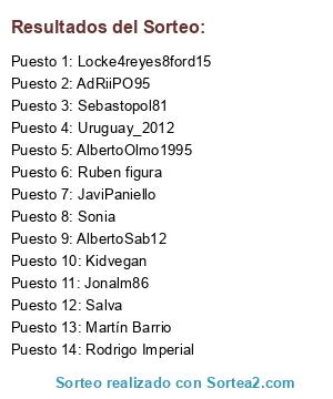 Lista de participantes: Martín Barrio, AlbertoOlmo1995, Ruben figura, Salva, JaviPaniello, Sonia, Locke4reyes8ford15, AdRiiPO95, Jonalm86, Kidvegan, AlbertoSab12, Sebastopol81, Rodrigo Imperial, Uruguay_2012.