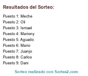 Lista de participantes: Oli, Meche, Carlos, Ismael, Dani, Aguado, Juanjo, Mario, Mariony.