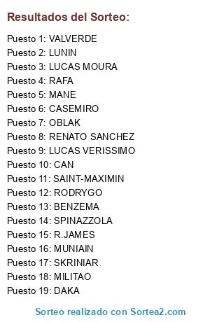 Lista de participantes: VALVERDE, CAN, SKRINIAR, LUNIN, MILITAO, LUCAS VERISSIMO, R.JAMES, SAINT-MAXIMIN, MANE, DAKA, SPINAZZOLA, RENATO SANCHEZ, OBLAK, RODRYGO, LUCAS MOURA, CASEMIRO, RAFA, BENZEMA, MUNIAIN.