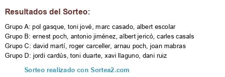 Lista de participantes: albert escolar, carles casals, toni jové, albert jericó, pol gasque, marc casado, roger carceller, david martí, dani ruiz, ernest poch, arnau poch, antonio jiménez, toni duarte, joan mabras, xavi llaguno, jordi cardús.