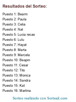 Lista de participantes: Beapm, Paula, Sandra, Nat, Hayat, Monica, Bearm, Celia, Lulu, Lucia recas, Tito, Cesar, Kat, Marta, Martina, Marcela.