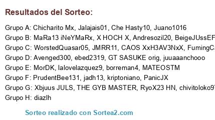 Lista de participantes: Juano1016, MATEOSTM, lalovelazquez9, PrudentBee131, ebed2319, GT SASUKE orig, WorstedQuasar05, CAOS XxH3AV3NxX, PanicJX, MorDK, RyoX23 HN, Avenged300, THE GYB MASTER, Jalajais01, Chicharito Mx, juuaaanchooo, Xbjuus JULS, chivitoloko9700, diazlh, borreman4, kriptoniano, Andresozil20, JMRR11, FumingCat, jadh13, Che Hasty10, X HOCH X, BeigeJUssEF, MaRa13 iNeYMaRx.