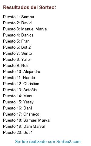 Lista de participantes: Yeray, Crisneco, Sento, Nando, Alejandro, Antoñin, Christian, Dani, Dani Marval, Danics, David, Manu, Manuel Marval, Noli, Samba, Samuel Marval, Fran, Yulio, Bot 1, Bot 2.