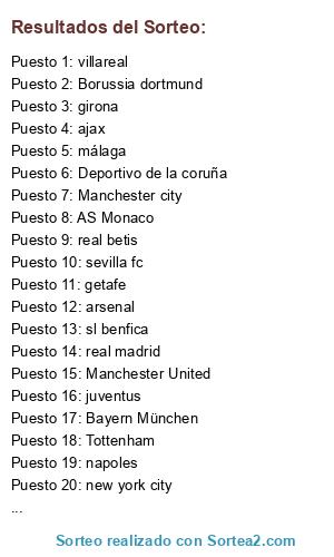 Lista de participantes: arsenal, málaga, Tottenham, AS Monaco, Manchester city, juventus, alcorcon, Borussia dortmund, getafe, sl benfica, new york city, Deportivo de la coruña, villareal, real betis, sevilla fc, girona, Bayern München, Manchester United, ajax, real madrid, napoles.