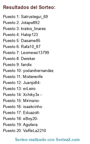 Lista de participantes: yodanihernandez, Halop123, kratos_linares, Leomessi13799, Moitenerife, Rafa10_87, Satrustegui_69, VaReLa2210, Eduazolt-, Juanjo84-, eBoy20-, Xchiky3x -, Dereker, Aguilera, Mirinano-, Jotape892, isaakcinho, Dasame85, fandix, erLeiro.