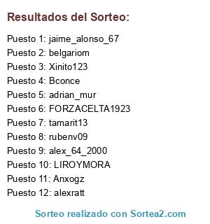 Lista de participantes: Anxogz, alexratt, rubenv09, Bconce, Xinito123, tamarit13, alex_64_2000, LIROYMORA, FORZACELTA1923, belgariom, jaime_alonso_67, adrian_mur.