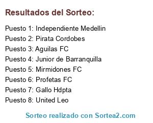 Lista de participantes: Junior de Barranquilla, Pirata Cordobes, Aguilas FC, Mirmidones FC, Profetas FC, Independiente Medellin, United Leo, Gallo Hdpta.