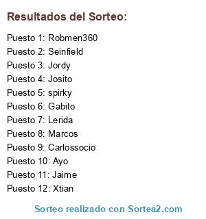Lista de participantes: Marcos, Ayo, Jordy, spirky, Robmen360, Jaime, Xtian, Carlossocio, Josito, Lerida, Gabito, Seinfield.